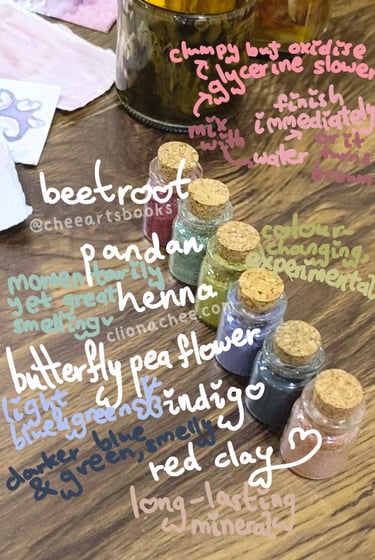 Butterfly pea (bluish + slight teal) mixture ~ Butterfly pea flower as the powder base. Beautiful blue and smells better than indigo. Yet, it's lighter in colour and oxidises faster too.